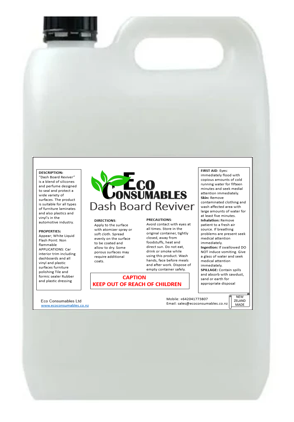 Dash Board Reviver is a premium blend of silicones and fragrance, specially formulated to protect a wide variety of surfaces. Ideal for both household and automotive use, it restores shine and leaves a fresh scent.