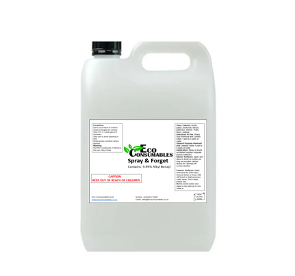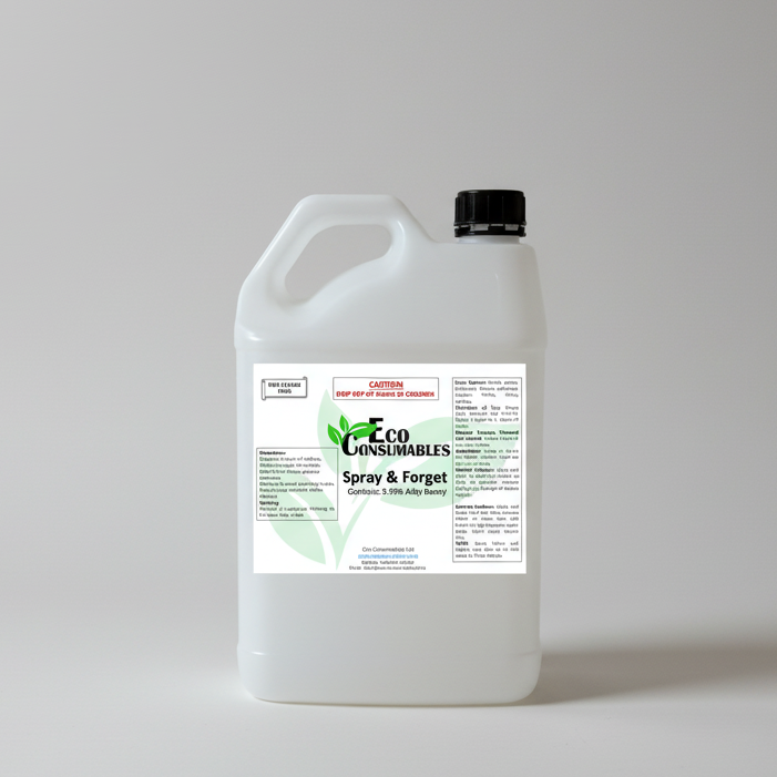 Eco Consumables Spray & Forget is a powerful outdoor cleaner formulated with 9.99% Alkyl Benzyl. It is designed to effectively remove and control moss, mould, mildew, algae, and lichen from a wide range of exterior surfaces.